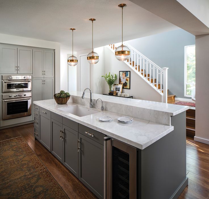 Gray Kitchens that Incorporate a island.